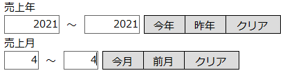 | 5 | 2021年の売上を集計したいのに、2022年も集計に含まれてくるのはなぜ? | 条件は「いつ~いつまで」を入力する形式ですが「いつ」だけ入力すると「いつ以降」の検索となります。 この場合「2021~2021」と入力する必要があります。 ※逆に「いつまで」に2021だけ入力すると、2021以前がすべて対象となります。 |